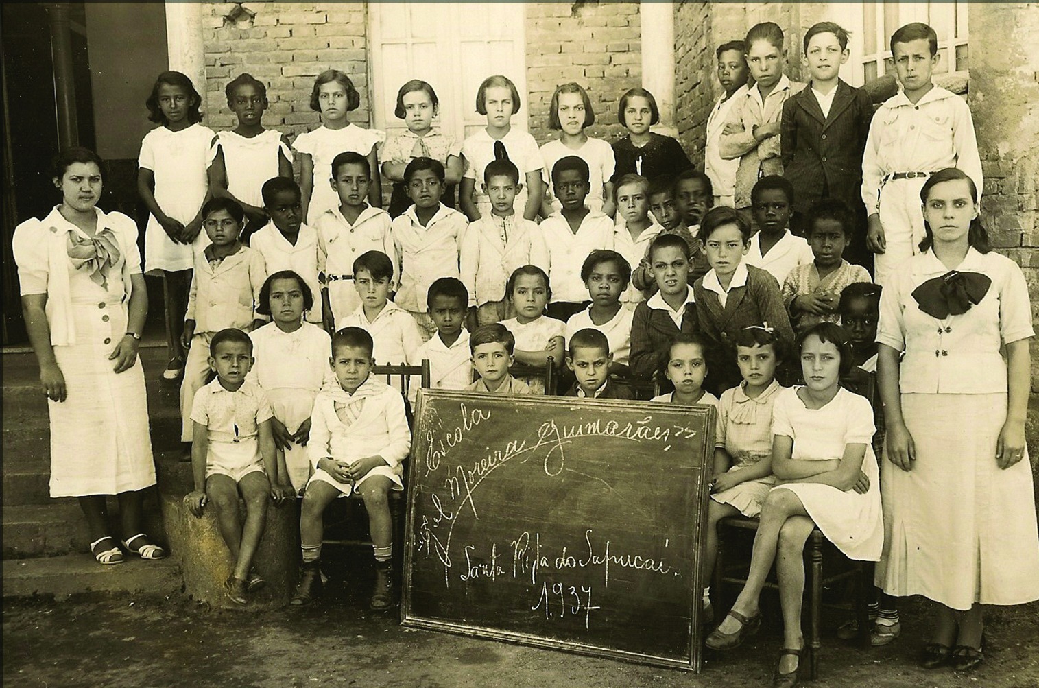A fotografia registrada em 1937 mostra uma das turmas da Escola General Moreira Guimarães, instituição que funcionava no antigo prédio da Maçonaria em Santa Rita do Sapucaí. O retrato, repleto de expressões sérias e roupas cuidadosamente alinhadas, preserva não apenas a memória escolar da época, mas também a participação de famílias tradicionais da cidade e a presença marcante de educadoras que ajudaram a formar gerações.