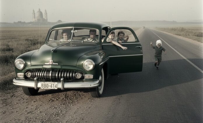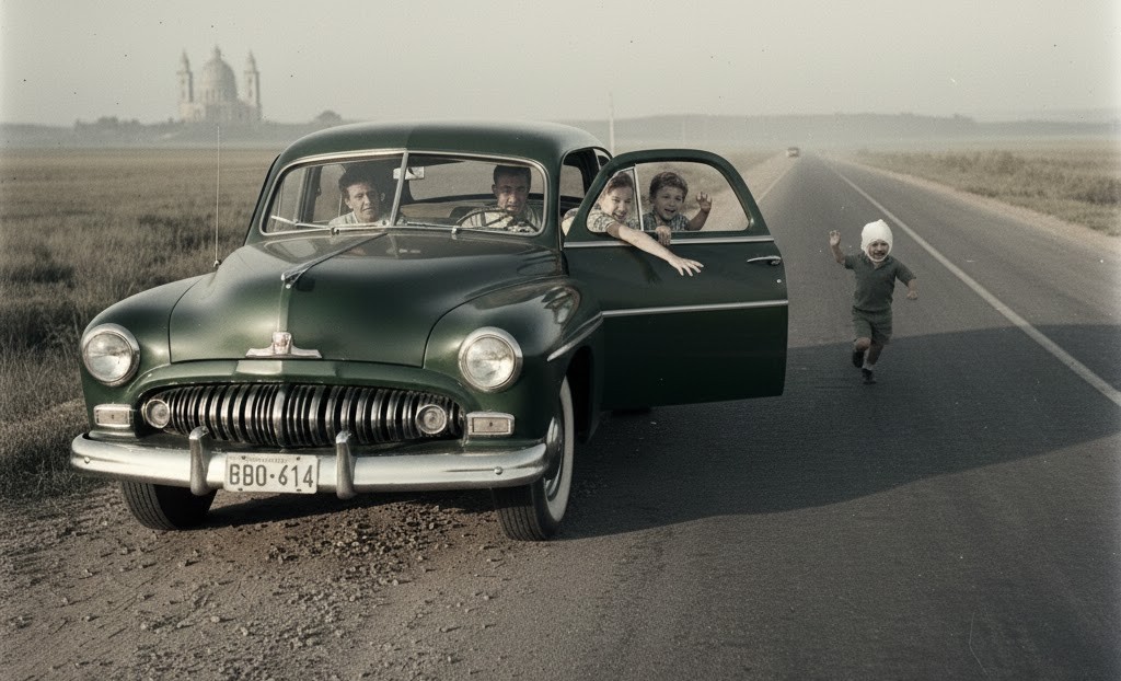 Num domingo de manhã, resolvemos fazer umas preces no Santuário de Aparecida, que ficava a poucos quilômetros de onde morávamos na base aérea de Guaratinguetá. Possuíamos então um Mercury 1949, 4 portas, cujas portas de trás se abriam para a frente. O banco da frente era inteiriço e com encosto alto, de tal forma que não se enxergava o banco de trás. Carro abastecido e a turma (Bruno, Breno, Brenda e Angelina) acomodada no banco de trás, seguimos pela Rodovia Presidente Dutra, que era ainda de pista simples.
