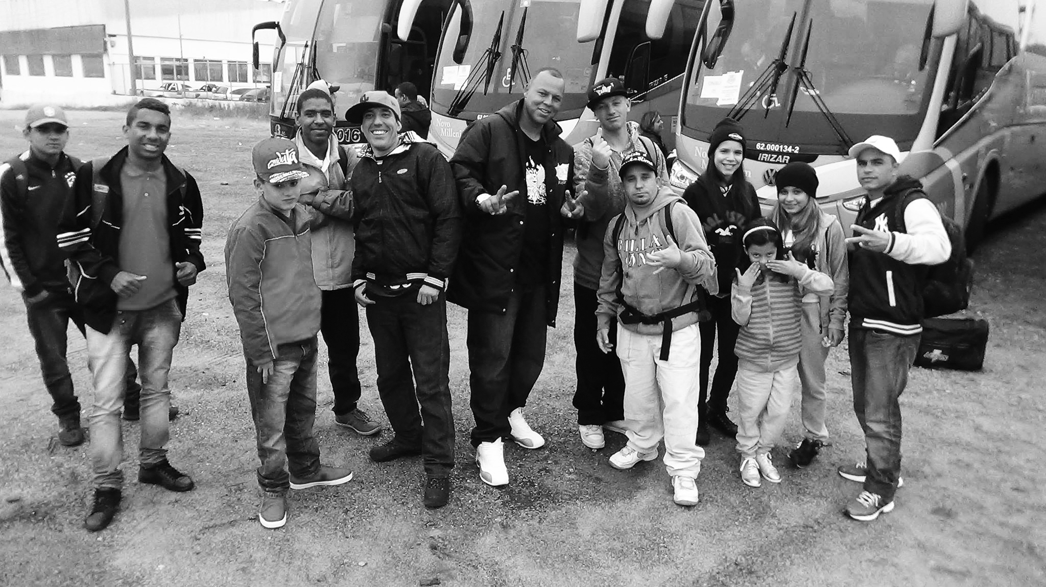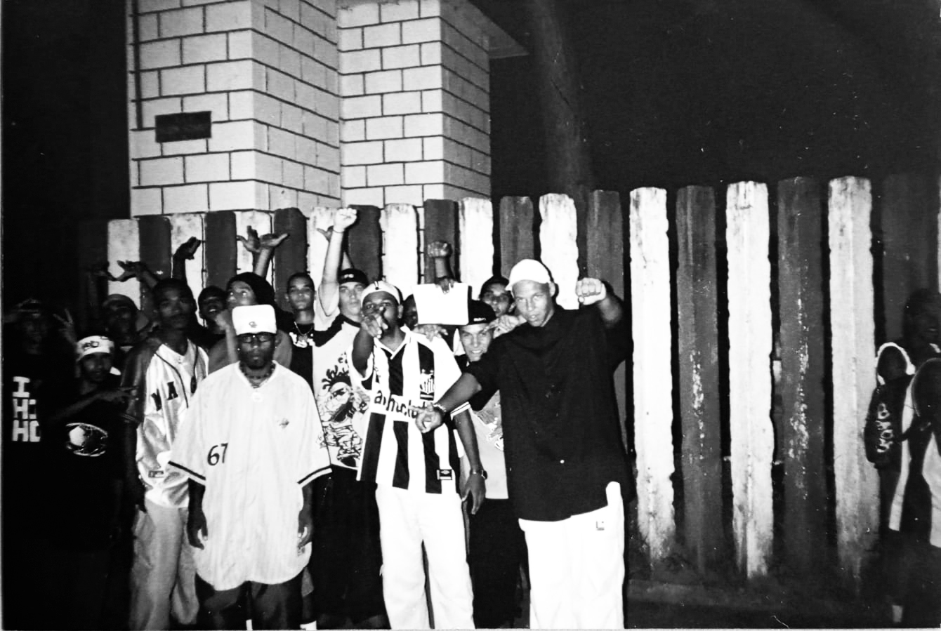 Passada essa fase de começar a dançar, a gente ainda não tinha ido a um baile. Isso só foi acontecer no início de 2000. Antes de terminar o ano anterior, dois discos muito importantes foram lançados: “Seja como for” do Xis e “Versos Sangrentos”, do Facção Central. Ambos eram muito politizados e discutiam a realidade da sociedade brasileira. Nós estávamos eufóricos com aquelas músicas e já tínhamos um acesso maior aos trabalhos por conta do surgimento do CD. Um dia, chegou a notícia de que o Nelson Triunfo e a Funk Cia iriam se apresentar no 18, casa de shows em Pouso Alegre. Na data do show, o evento estava marcado para cinco da tarde e chegamos às duas! Ainda não tinha ninguém e ficamos por ali, até que apareceu o Nelson Triunfo. Era um dos caras mais importantes do cenário e estava ali na minha frente! Nunca pensei que pudesse vê-lo de perto, muito menos pegar na sua mão. Naquele dia, eu tive a oportunidade de ver o Edvaldo e o Fião dançarem com ele e com a Funk Cia inteira! Até então, achava que eles eram de outro planeta! Aquele evento foi um choque de realidade porque eu também descobri que havia grupos em Pouso Alegre que se apresentavam na região. Um deles, chamado “Visão Geral”, tinha como integrante o Serginho, irmão do Edvaldo. Dogueto, Paula do Prado e Néia também eram integrantes. Ali eu pensei: “Acho que dá pra gente fazer isso também! Se os vizinhos conseguem, a gente consegue!”