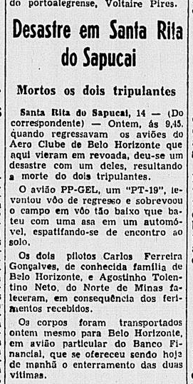As vítimas que tripulavam o Fairchild PT-19 não eram desconhecidas. Carlos Ferreira Gonçalves era de Belo Horizonte e pertencia a uma família tradicional da capital mineira. O sobrenome, à época, figurava entre comerciantes e empresários de prestígio da cidade. Jovem conhecido por seu entusiasmo com a aviação civil, fazia parte do grupo de pilotos formados pelo Aeroclube de Minas Gerais, que mantinha intensa atividade de treinamento e demonstração em todo o estado. Ao seu lado viajava Agostinho Tolentino Neto, natural de Espinosa, no norte do estado. Filho de uma região distante e de hábitos sertanejos, representava a nova geração de mineiros atraídos pelo fascínio do voo. Coincidência ou não, a rua que hoje leva o seu nome, fica a menos de 10 minutos do campo de aviação da pequena cidade.