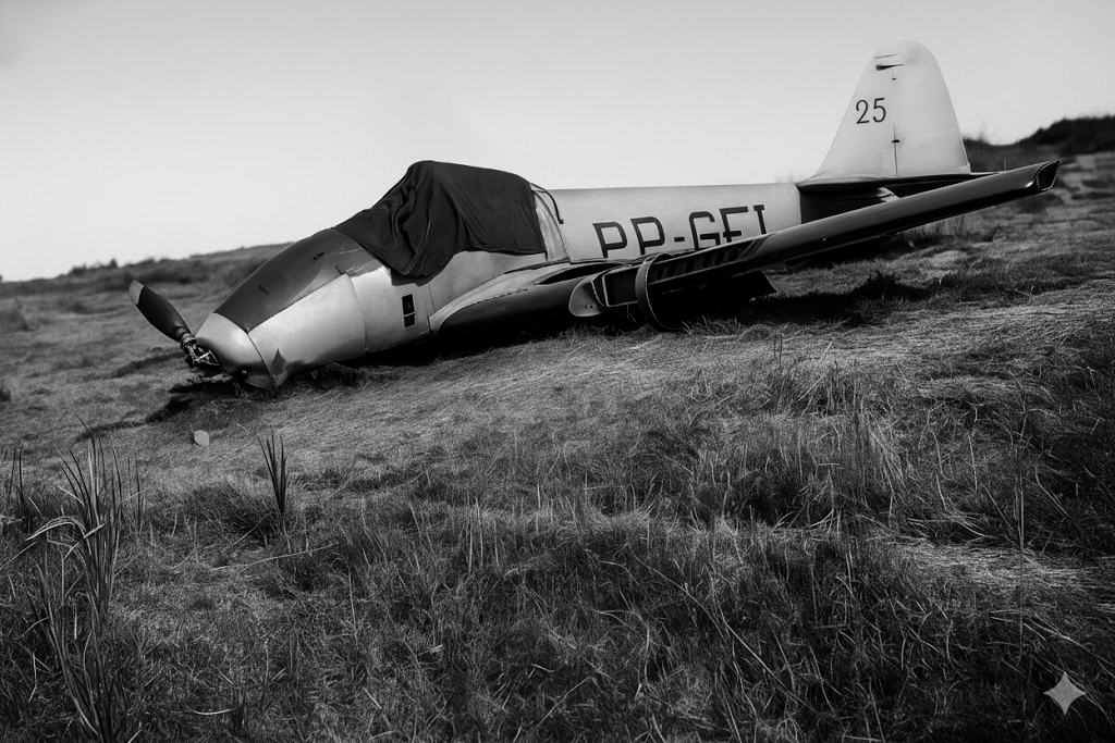 O fotógrafo se inclinou ligeiramente e enquadrou a cena cuidando para que a fuselagem e a cauda com o número 25 ficassem visíveis. Ao pressionar o obturador, imortalizou o instante em película. Era um tipo de imagem que não pedia legenda. Falava sozinha: o avião abatido, o olhar atordoado dos homens ao redor, o capim ressecado e o instante guardado entre o espanto e a tristeza.