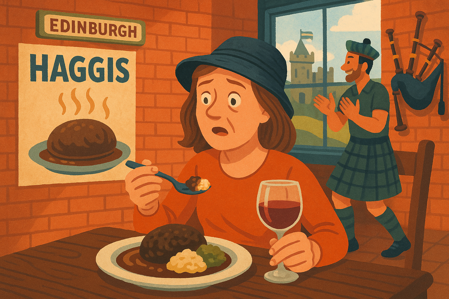 Muito bem. Para começar, o prato típico da Escócia é o chamado “haggis”. Quando a guia explicou do que se tratava, a maioria torceu o nariz, fez cara de enjoo, muitos disseram que não comeriam nem por um milhão e assim por diante. Quanto mais o pessoal comentava, mais aumentava a minha curiosidade. Para dizer a verdade, eu não sou enjoada para comer. Não me dando a tal dobradinha, os demais pratos eu encaro numa boa. Pensei então comigo: Vou comer esse trem! Esse tal de haggis, que é o prato nacional da Escócia, é um tipo de pudim preparado com vísceras de ovelha (coração, fígado e pulmões), picadas e misturadas com sebo (gordura animal) e aveia. A mistura é temperada com cebola, pimenta e outras especiarias. Esse recheio é cozido dentro do estômago do animal e é frequentemente servido com purê de nabos e de batatas. Na hora de servir, retira-se o recheio de dentro da tripa (estômago), ficando com o formato de um quibe grande. A aparência até que é convidativa, pois vem muito bem empratado, e ainda acompanha um molho que deve ser derramado em cima do dito cujo. Olhei, senti o aroma, tentei esquecer os ingredientes, engoli seco, tomei um gole de vinho, segurei na mão de Deus e fui! Primeira garfada, tudo bem. As porções que eu colocava no garfo eram compostas por trinta por cento de haggis e setenta por cento de purê. Segunda garfada, mais ou menos. Apesar de apreciar comida levemente apimentada, desta vez não deu. O cozinheiro deve ter errado a mão, pois estava insuportável, não pelo sabor, mas pela quantidade de pimenta. Não consegui passar disso, comi os purês, tomei o restante do vinho e saí do restaurante com fome. Mas valeu pela experiência. Agora eu conheço o prato típico da Escócia, provei, mas não aprovei. Fica a dica!