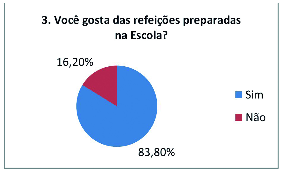 No campo das preferências, o frango (filé) aparece como o alimento mais apreciado, com 150 indicações, seguido pelo peixe, com 104. A variedade do cardápio também se mostra adequada, já que apenas uma pequena parcela dos alunos (6,15%) declarou não gostar das opções apresentadas.